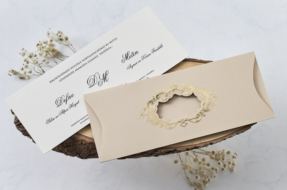 Invitatii de nunta confectionate dintr-un carton mat destinat textului. Acesta se introduce intr-un plic, tip buzunar cu model iesit in relief si decupaj prin care se vede numele mirilor sau initialele lor. Invitatia se personalizeaza cu textul pe care il doriti, corespunzator evenimentului dvs.