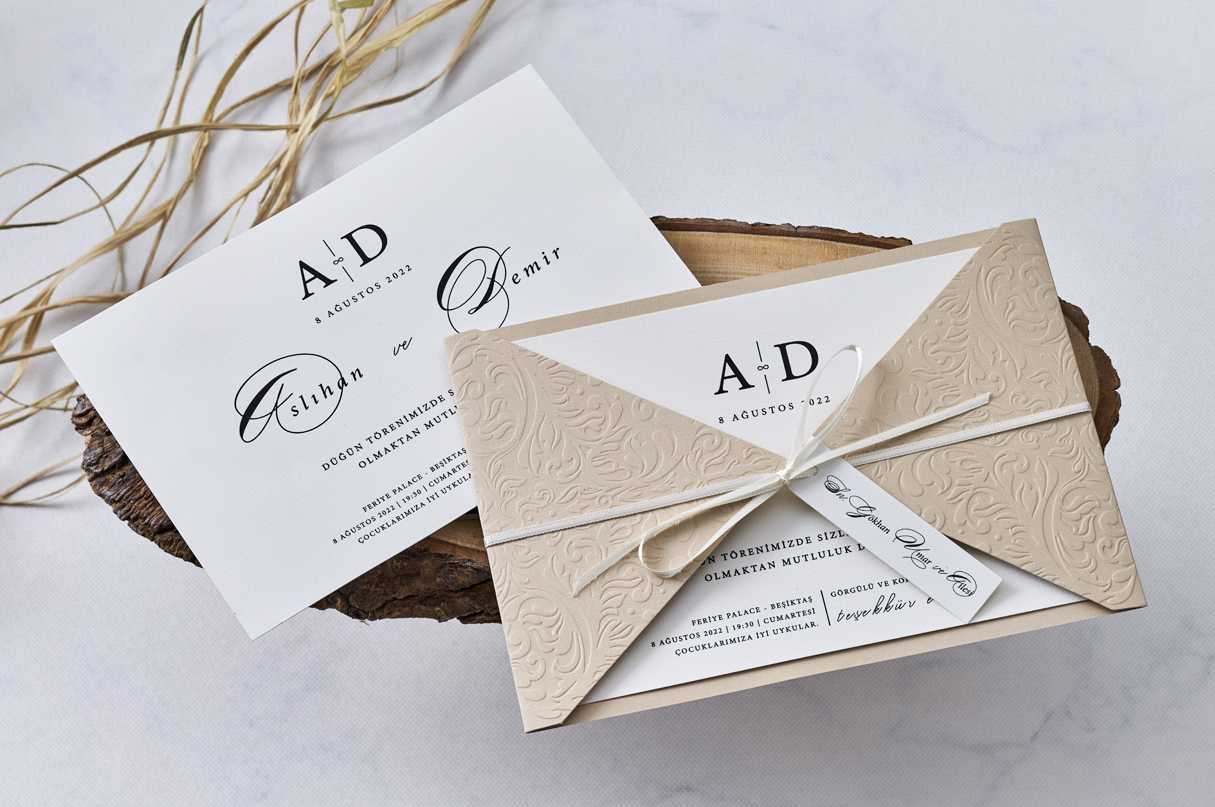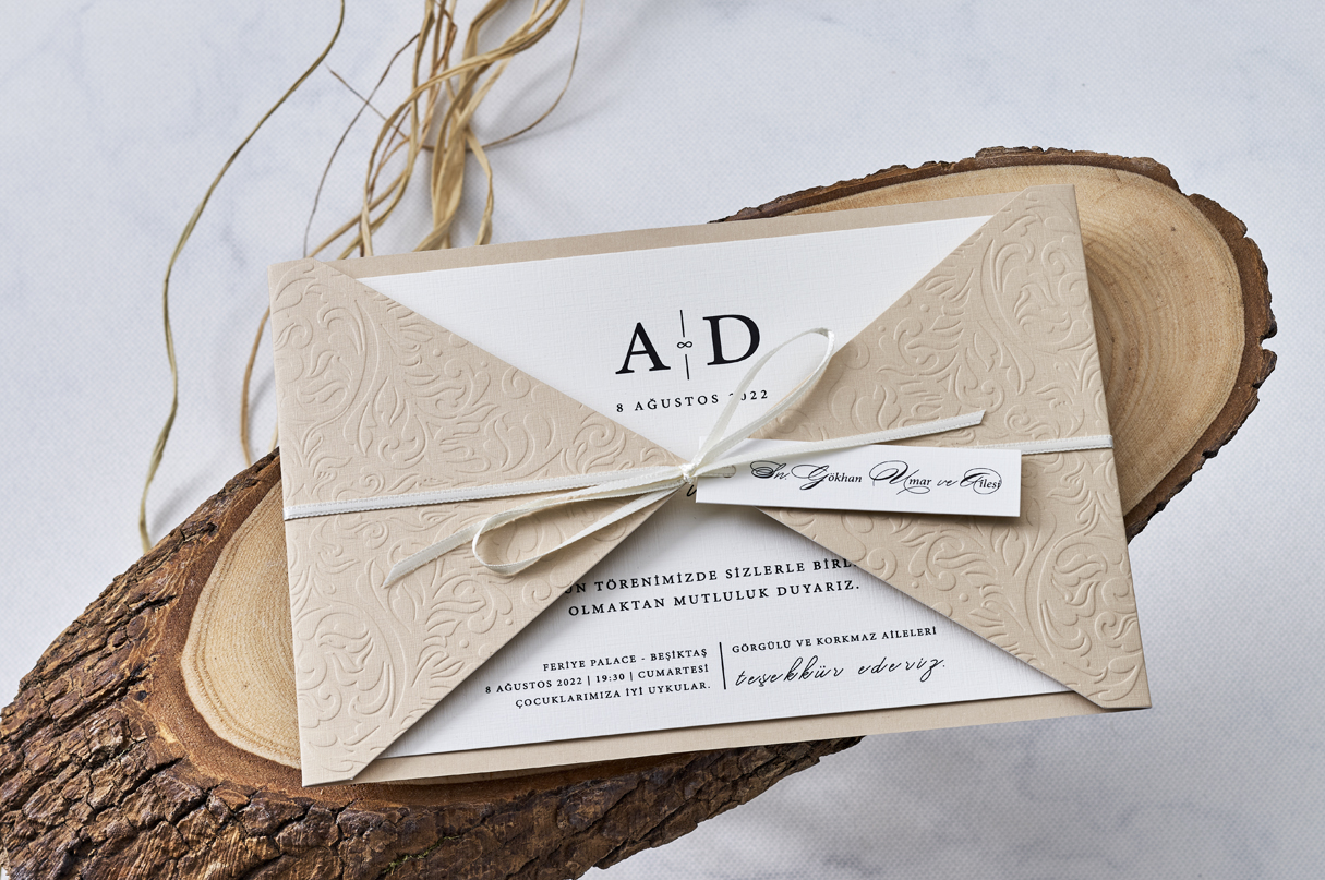 Invitatii de nunta confectionate dintr-un carton mat destinat textului. Acesta se pune intr-o alta piesa care se pliaza si se prinde cu un snur de care este prins un cardulet (cardul nu se printeaza, este destinat numelui persoanelor invitate). Acest model nu contine plic clasic. Invitatia se personalizeaza cu textul pe care il doriti, corespunzator evenimentului dvs.