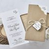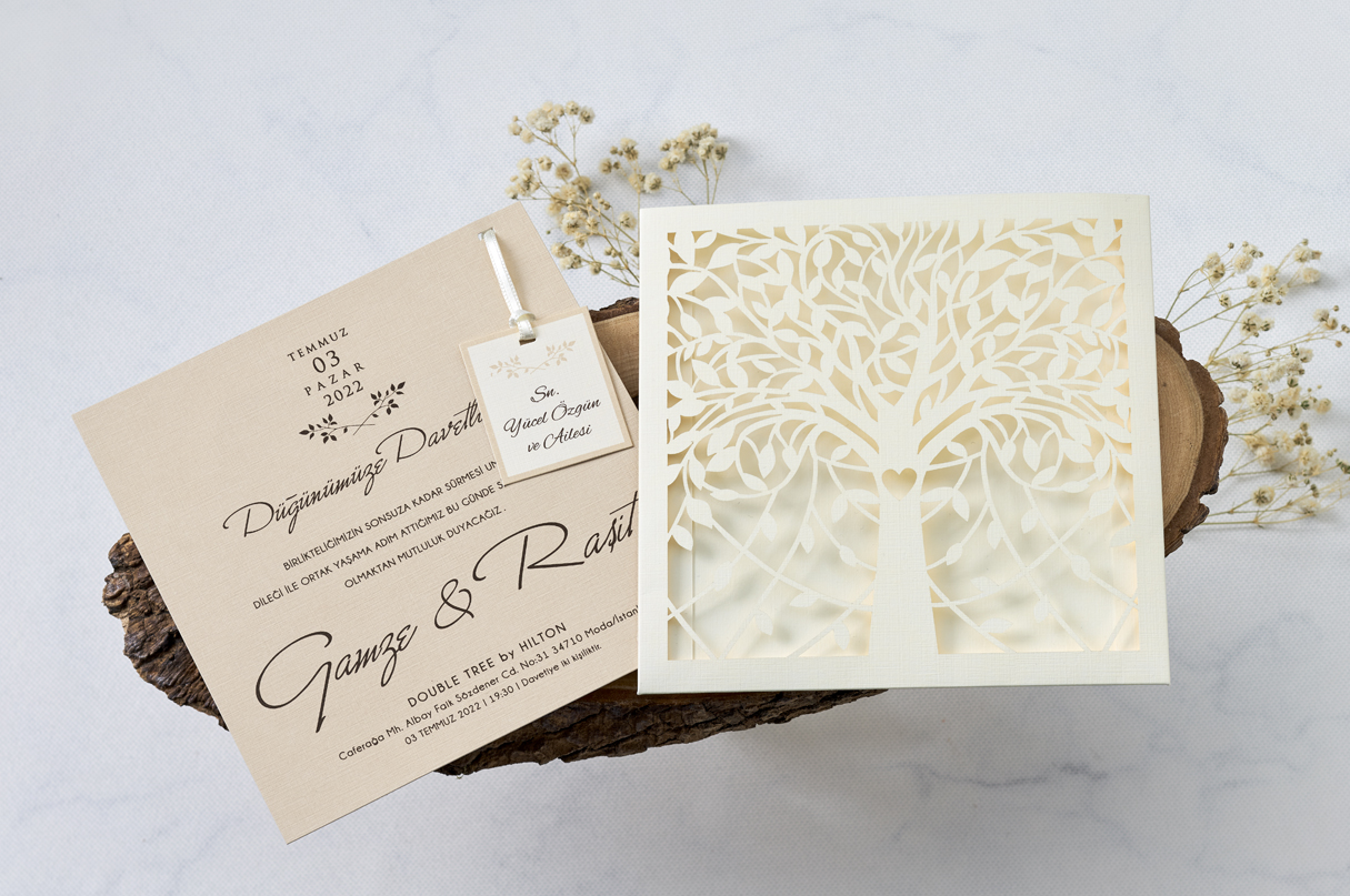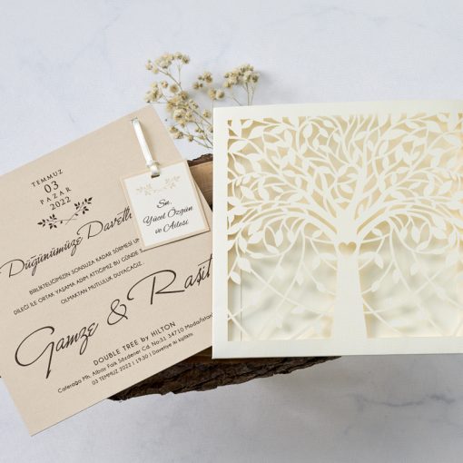 Invitatii de nunta confectionate dintr-un carton lucios destinat textului accesorizat cu un snur de care este prins un cardulet (cardul nu se tipareste). Acesta se introduce intr-un plic tip buzunar care are decupaje sub forma unui pom. Acest model nu contine plic clasic. Invitatia se personalizeaza cu textul pe care il doriti, corespunzator evenimentului dvs.