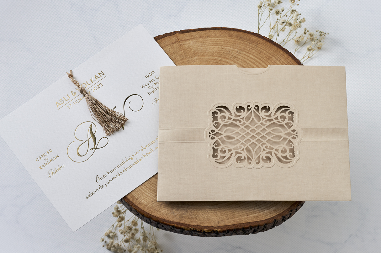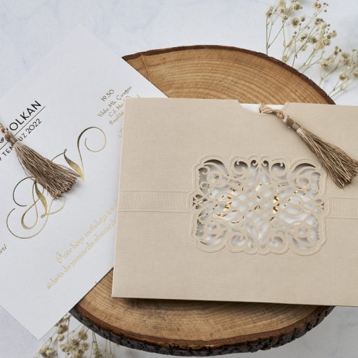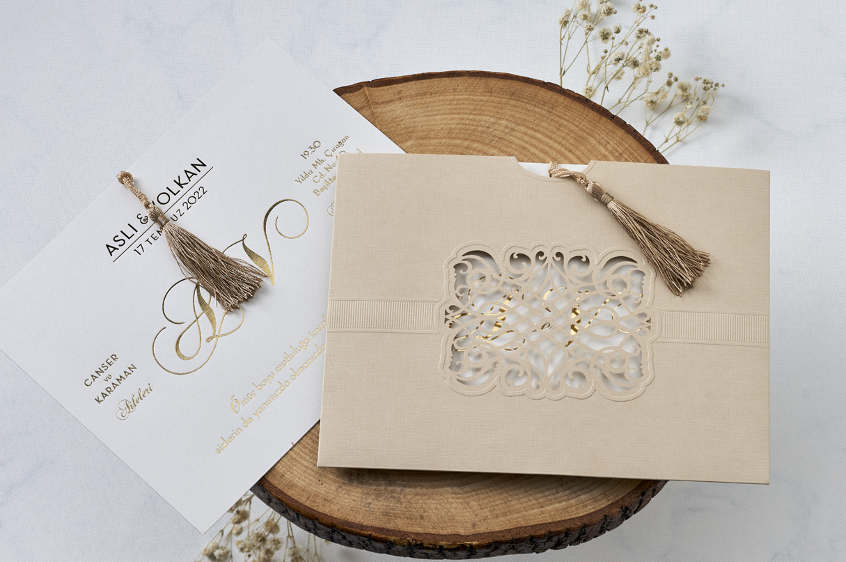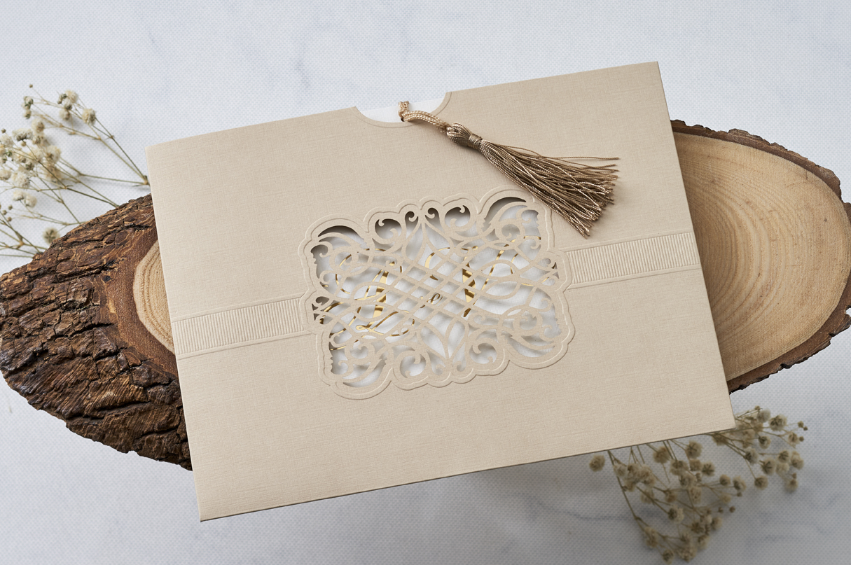 Invitatii de nunta confectionate dintr-un carton mat destinat textului accesorizat cu un ciucuras. Acesta se introduce intr-un plic tip buzunar cu un decupaj la mijloc prin care se vede numele mirilor. Acest model nu contine plic clasic. Invitatia se personalizeaza cu textul pe care il doriti, corespunzator evenimentului dvs.