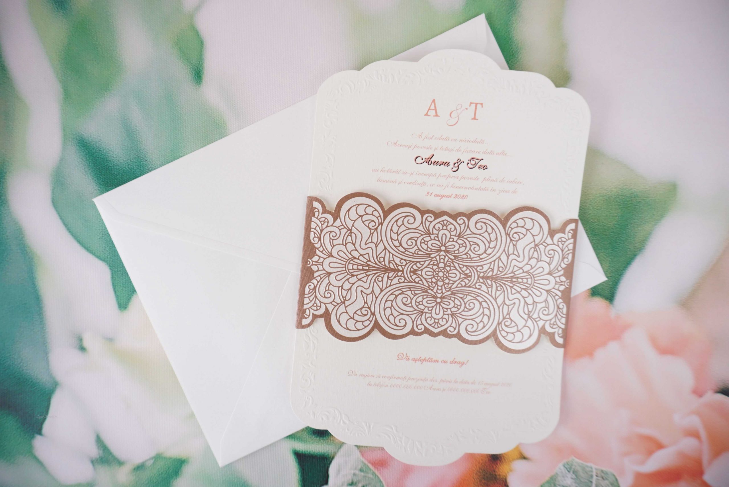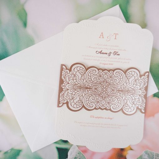 Invitatie de nunta confectionata din carton mat destinat textului care se prinde in alt carton cu model in relief. Nu se pliaza. Plicul este inclus în pret. Invitatia se personalizeaza cu textul pe care il doriti, corespunzator evenimentului dvs.