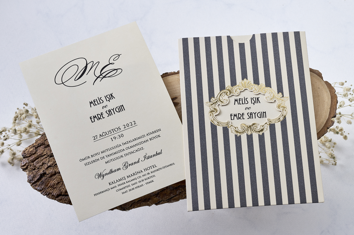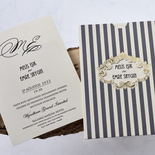 Invitatii de nunta confectionate dintr-un carton mat destinat textului. Acesta se introduce intr-un plic tip buzunar care prezinta model in dungi si un decupaj la mijloc prin care se vede numele mirilor. Acest model nu contine plic clasic. Invitatia se personalizeaza cu textul pe care il doriti, corespunzator evenimentului dvs.