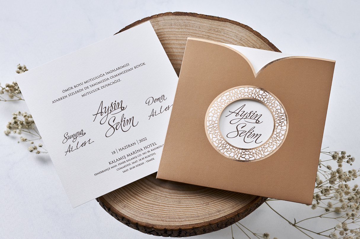 Invitatii de nunta confectionate dintr-un carton sidefat destinat textului. Acesta se introduce intr-o alta piesa tip buzunar cu model iesit in relief si un decupaj prin care se vede numele sau initialele mirilor. Invitatia se personalizeaza cu textul pe care il doriti, corespunzator evenimentului dvs.