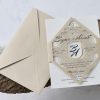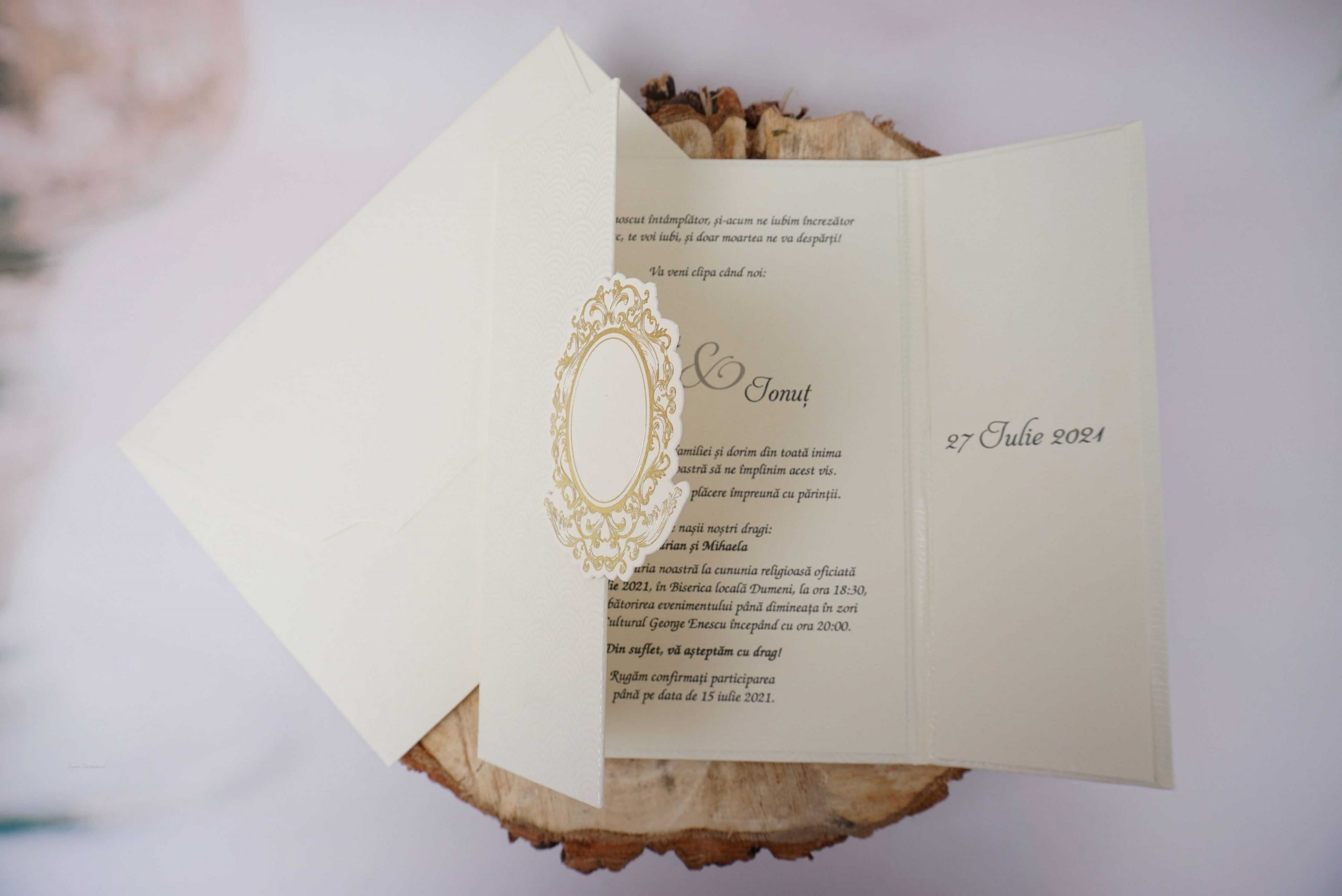 Invitatii de nunta confectionate dintr-un carton gros, mat destinat textului. Aceasta se pliaza in trei si se prinde, dupa care se introduce intr-un plic. Invitatia se personalizeaza cu textul pe care il doriti, corespunzator evenimentului dvs.