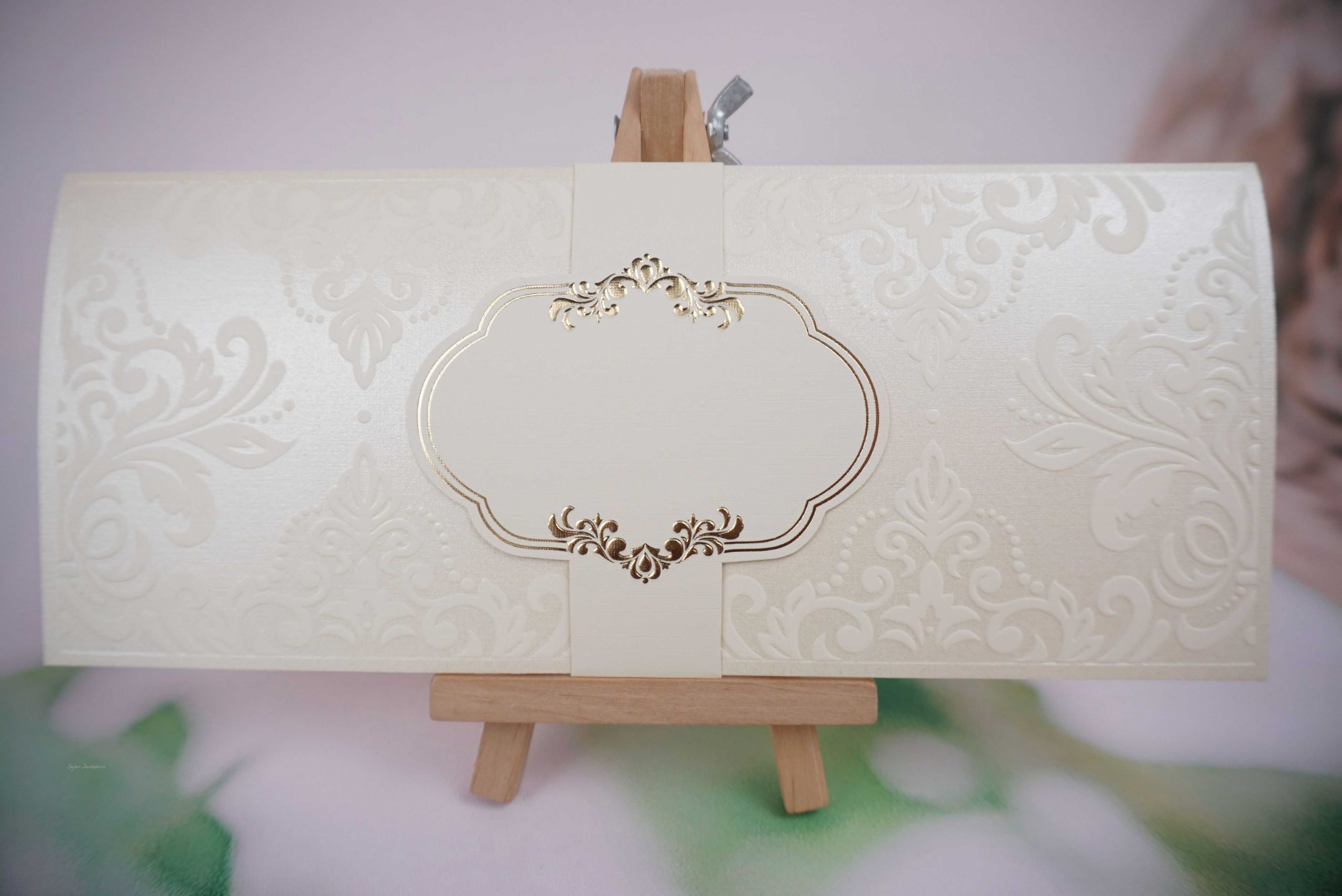 Invitatii de nunta confectionate dintr-un carton destinat textului care se pliaza in doua pe orizontala. Se inchide cu ajutorul unei bentite imprimata cu model. Acest model de invitatie nu contine plic. Invitatia se personalizeaza cu textul pe care il doriti, corespunzator evenimentului dvs.