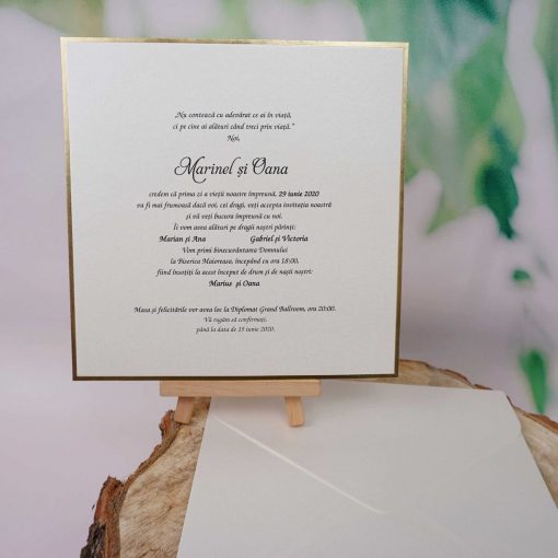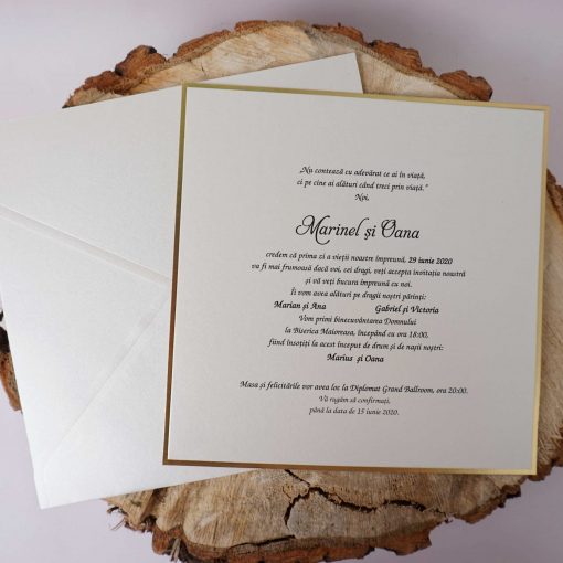 Invitatii de nunta confectionate dintr-un carton lucios. Textul se tipareste pe intreaga suprafata. Nu se pliaza, plicul este inclus in pret. Invitatia se personalizeaza cu textul pe care il doriti, corespunzator evenimentului dvs.