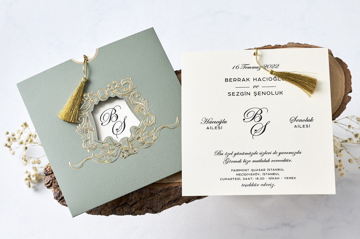 Invitatii de nunta confectionate dintr-un carton mat destinat textului accesorizat cu un snur cu franjuri. Acesta se introduce intr-o alta piesa tip buzunar cu model in relief. Invitatia nu contine plic clasic. Invitatia se personalizeaza cu textul pe care il doriti, corespunzator evenimentului dvs.