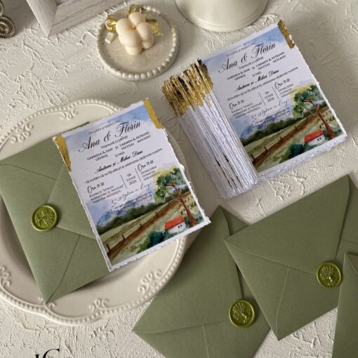Invitatie Nunta cu Model Watercolor Rustic Foita aurie si Sigiliu face parte din categoria Invitatii Nunta Colectie Margini Franjurate.