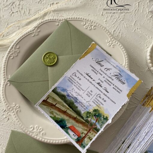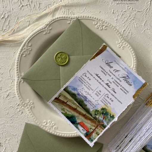 Invitatie Nunta cu Model Watercolor Rustic Foita aurie si Sigiliu