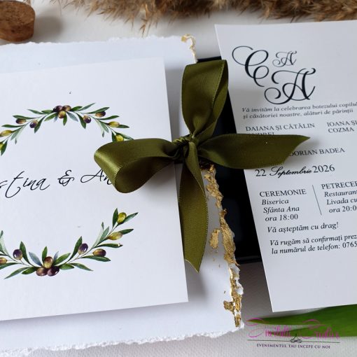 Invitatii de nunta cu ramuri de maslin si funda verde olive