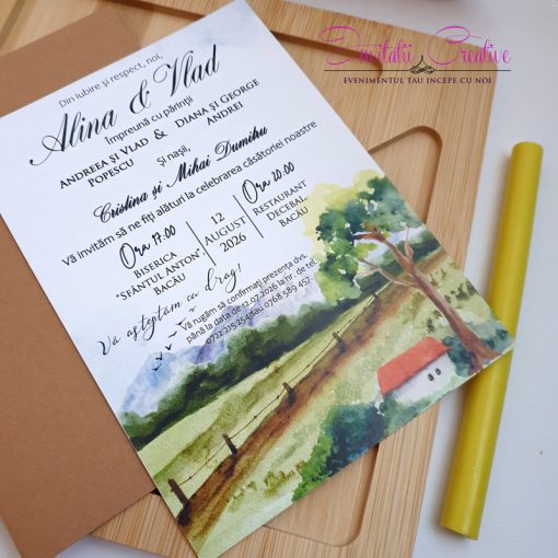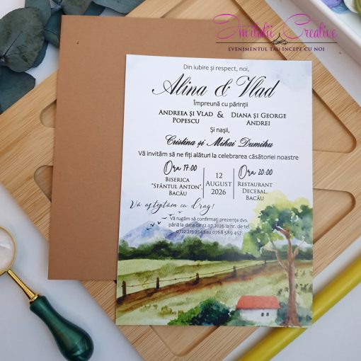 Invitatie de nunta cu peisaj rustic verde
