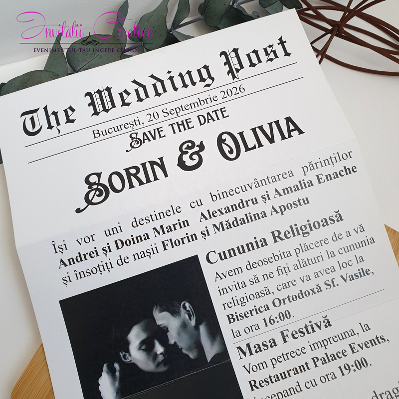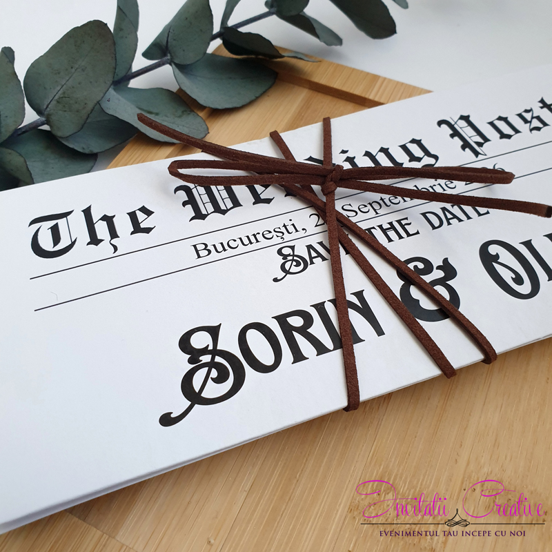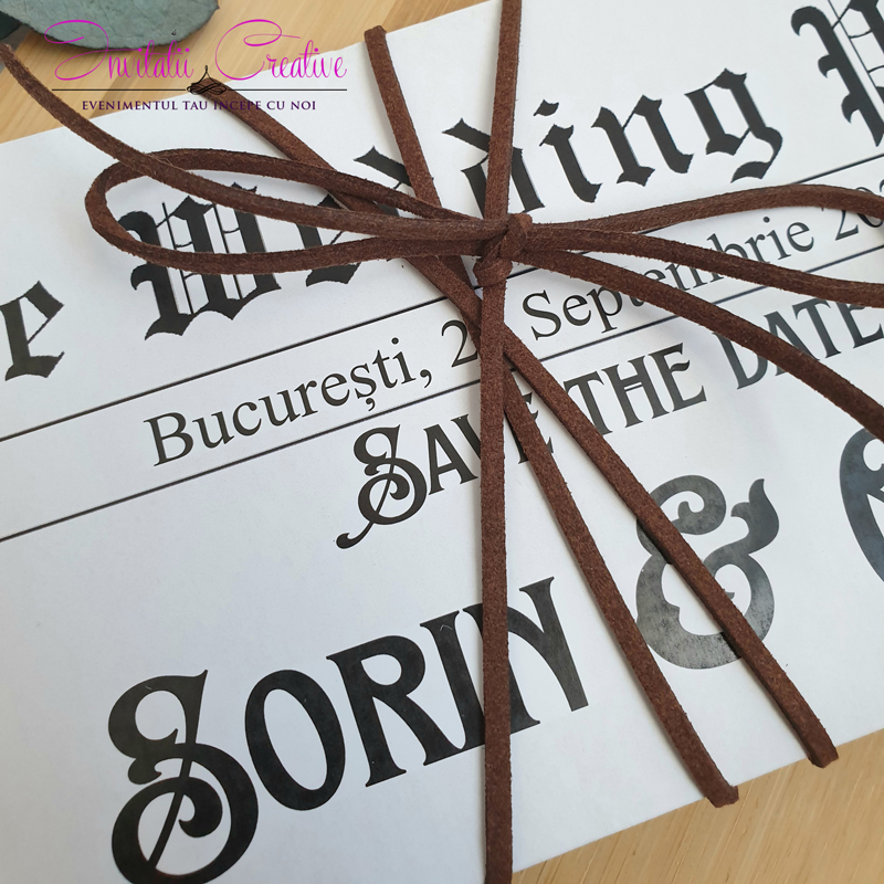 Invitatie tematica pentru nunta, in forma unui ziar cu aspect vintage. Invitatia tip ziar este realizata din hartie mata accesorizata cu snur din piele ecologica.