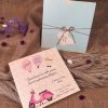 Invitatii de nunta confectionate dintr-un carton lucios, cu model floral destinat textului. Acesta se ataseaza la alta piesa care se pliaza si se leaga cu o sfoara accesorizata cu o eticheta in forma de fluturas destinata numelor invitatilor (eticheta nu se printeaza). Invitatia nu contine plic clasic.