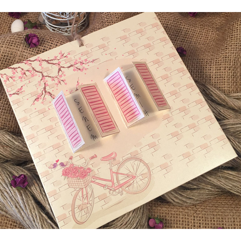 Invitatii de nunta confectionate dintr-un carton lucios accesorizat cu o sfoara destinat textului. Acesta se introduce intr-un plic tip buzunar ce prezinta doua ferestre care se deschid, un model floral si o bicicleta. Invitatia nu contine plic clasic.