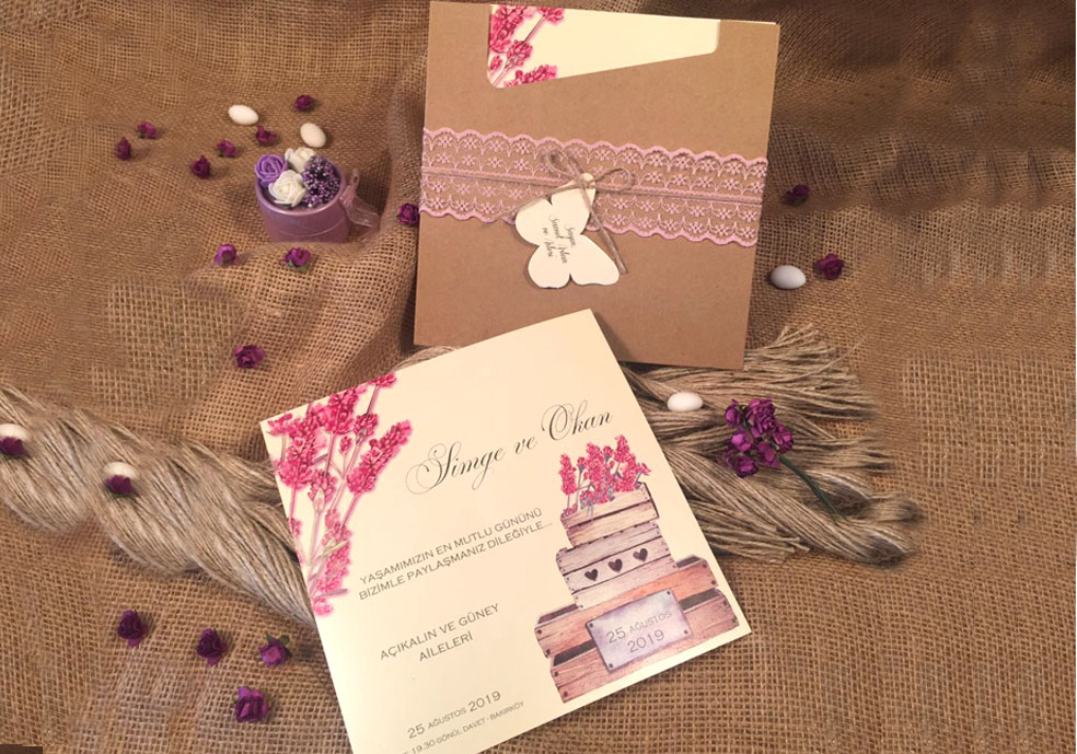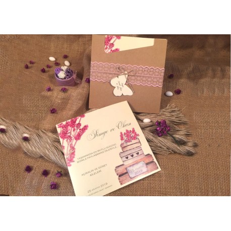 Invitatii de nunta confectionate dintr-un carton lucios cu striatii destinat textului. Acesta se introduce intr-un plic tip buzunar de tip kraft care se prinde cu ajutorul unei dantele si a unui snur accesorizat cu o eticheta destinata numelor invitatilor (etichetele nu se printeaza).