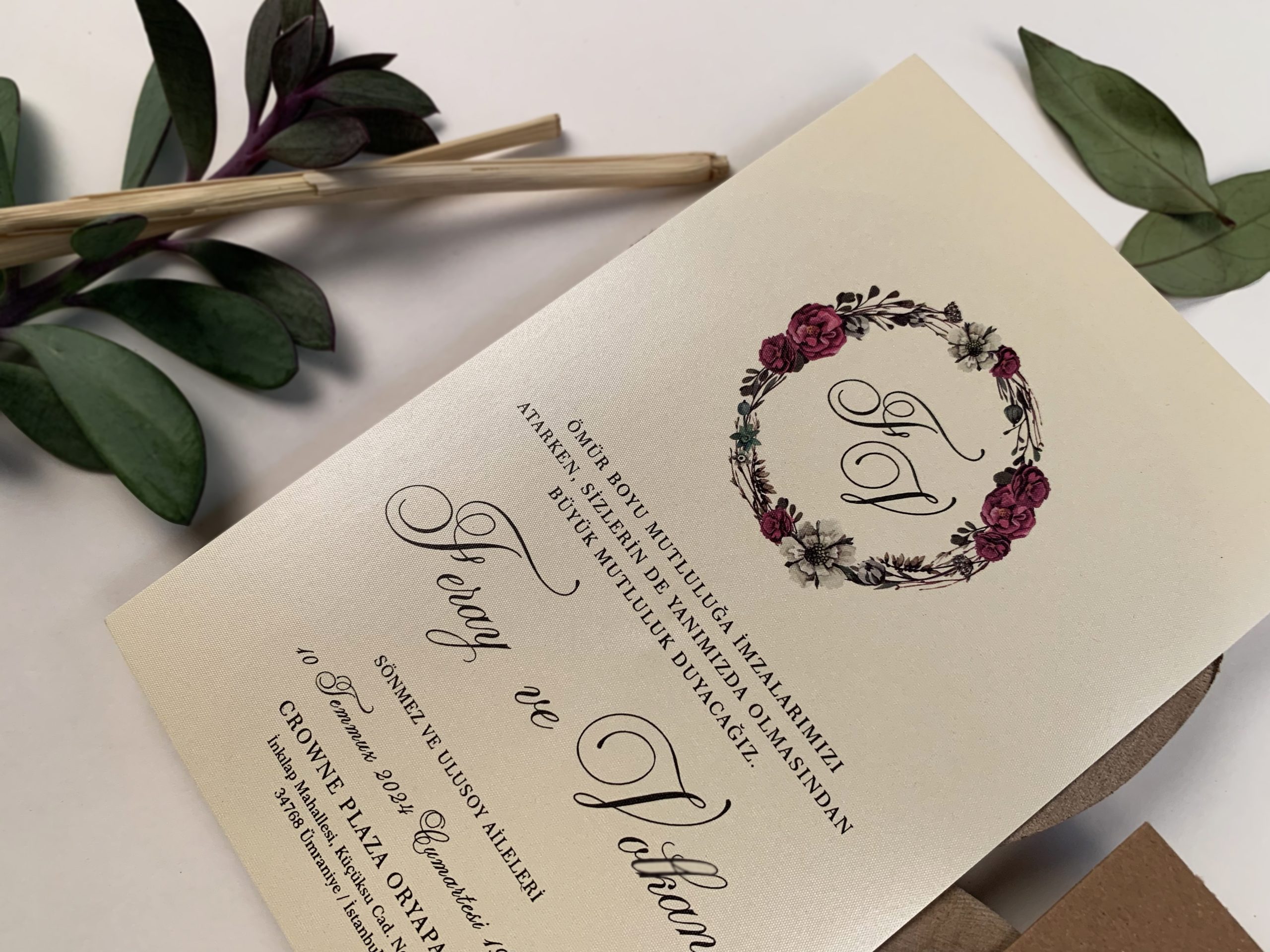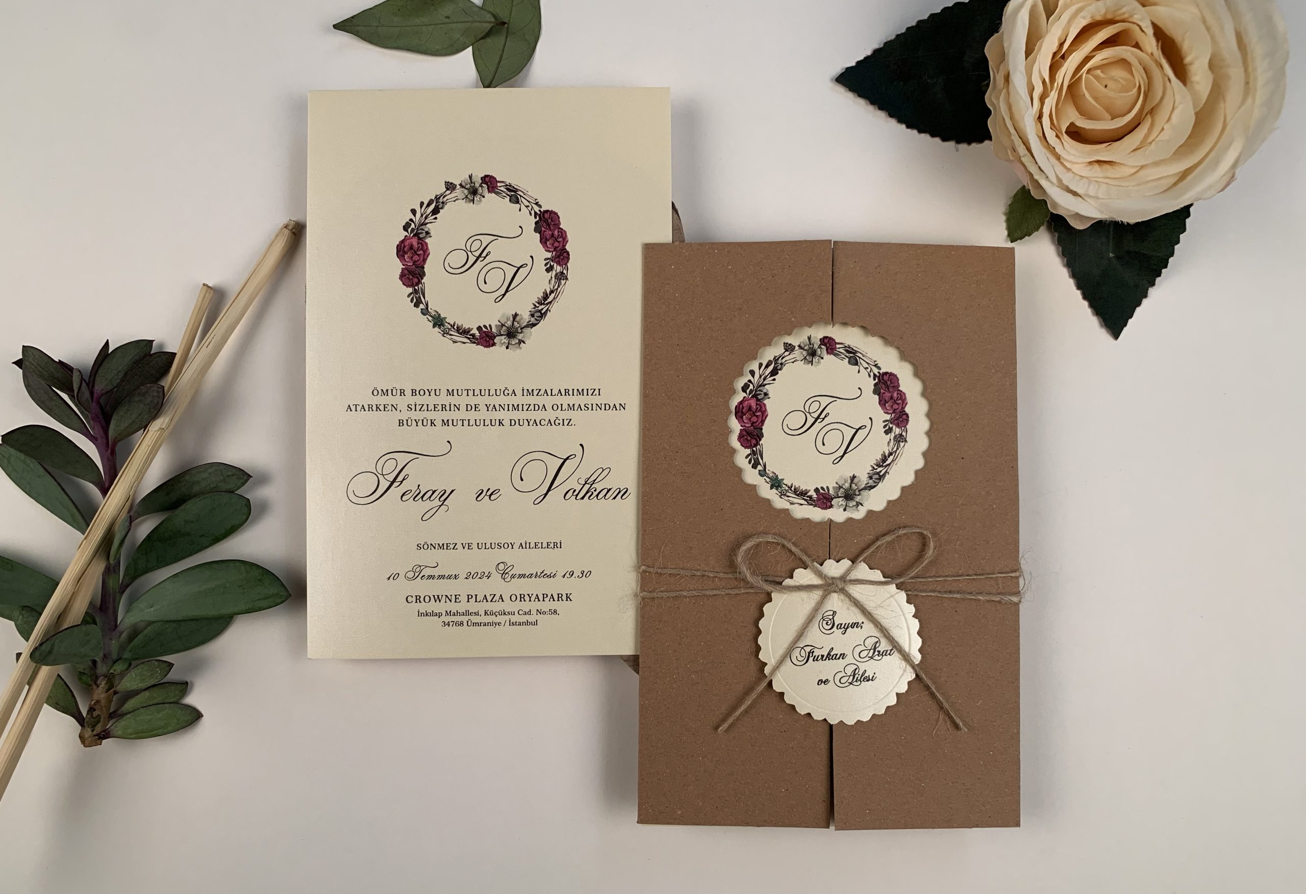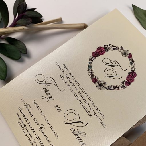 Invitatii de nunta confectionate dintr-un carton lucios cu striatii destinat textului. Acesta se introduce intr-o alta piesa din carton kraft care se pliaza in doua si prezinta un decupaj in partea superioara. Plicul se inchide cu ajutorul unei sfori si a unei etichete destinate numelor invitatilor (etichetele nu se printeaza). Modelul nnu contine plic clasic.