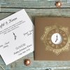 Invitatii de nunta confectionate dintr-un carton lucios cu striatii accesorizat cu o panglica destinat textului. Acesta se introduce intr-un plic tip buzunar care prezinta un decupaj. Nu contine plic clasic.