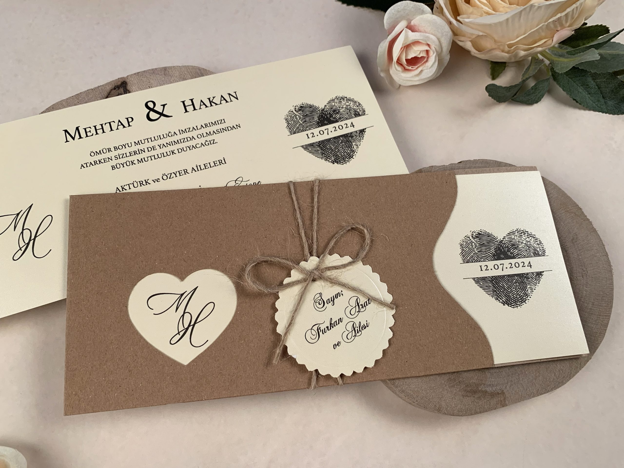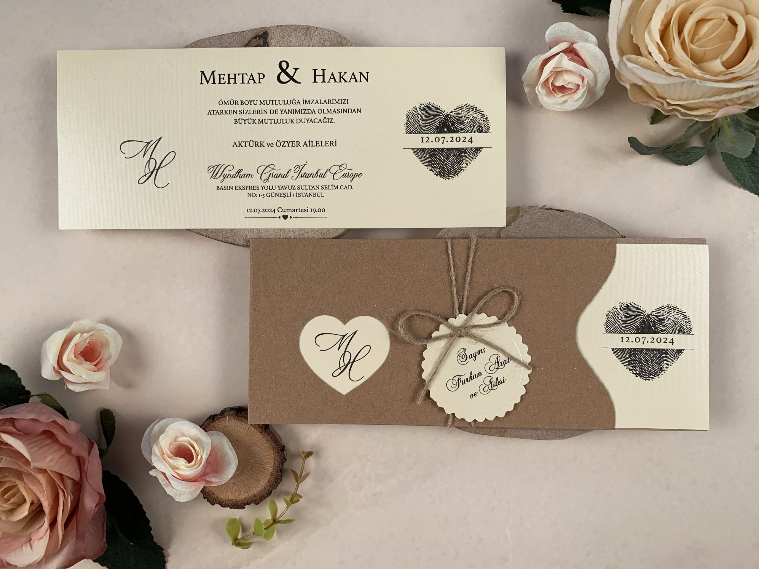 Invitatii de nunta confectionate dintr-un carton lucios destinat textului. Acesta se introduce intr-un plic confectionat dintr-un carton reciclat, decupat in partea stanga si in partea dreapta si care se leaga cu o sfoara accesorizata cu o eticheta destinata numelor invitatilor (eticheta nu se printeaza). Nu contine plic clasic.