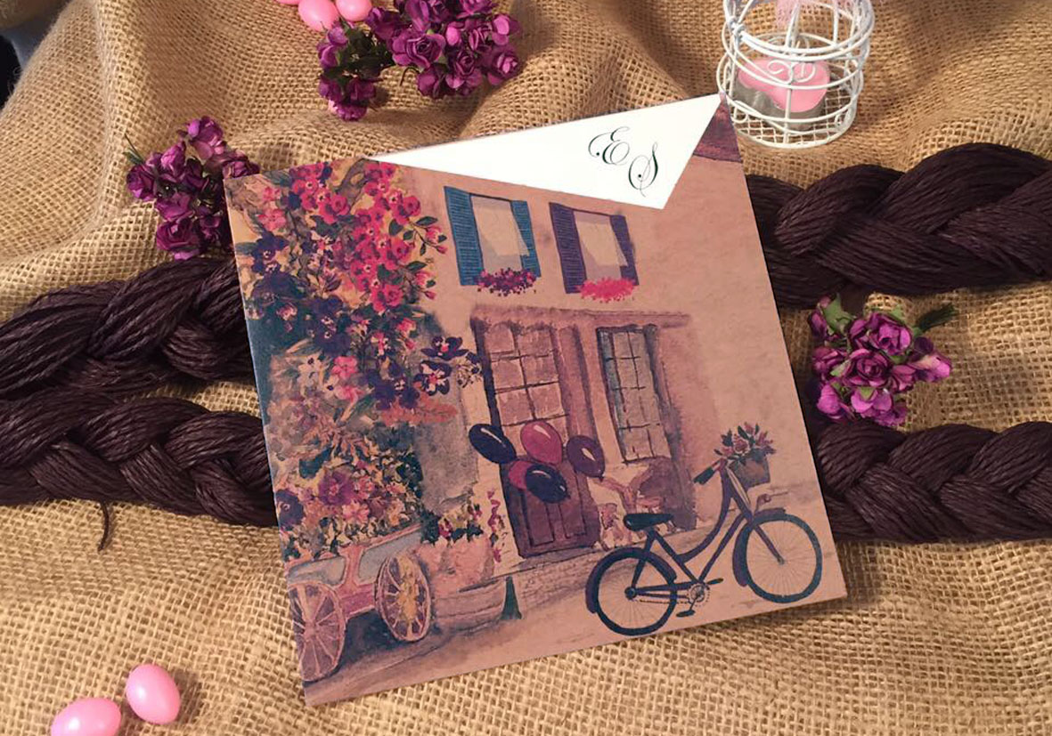Invitatii de nunta confectionate dintr-un carton lucios destinat textului. Acesta se introduce intr-un plic tip buzunar din carton reciclat, ce prezinta niste flori, cladiri, baloane si bicicleta. Nu contine plic clasic.