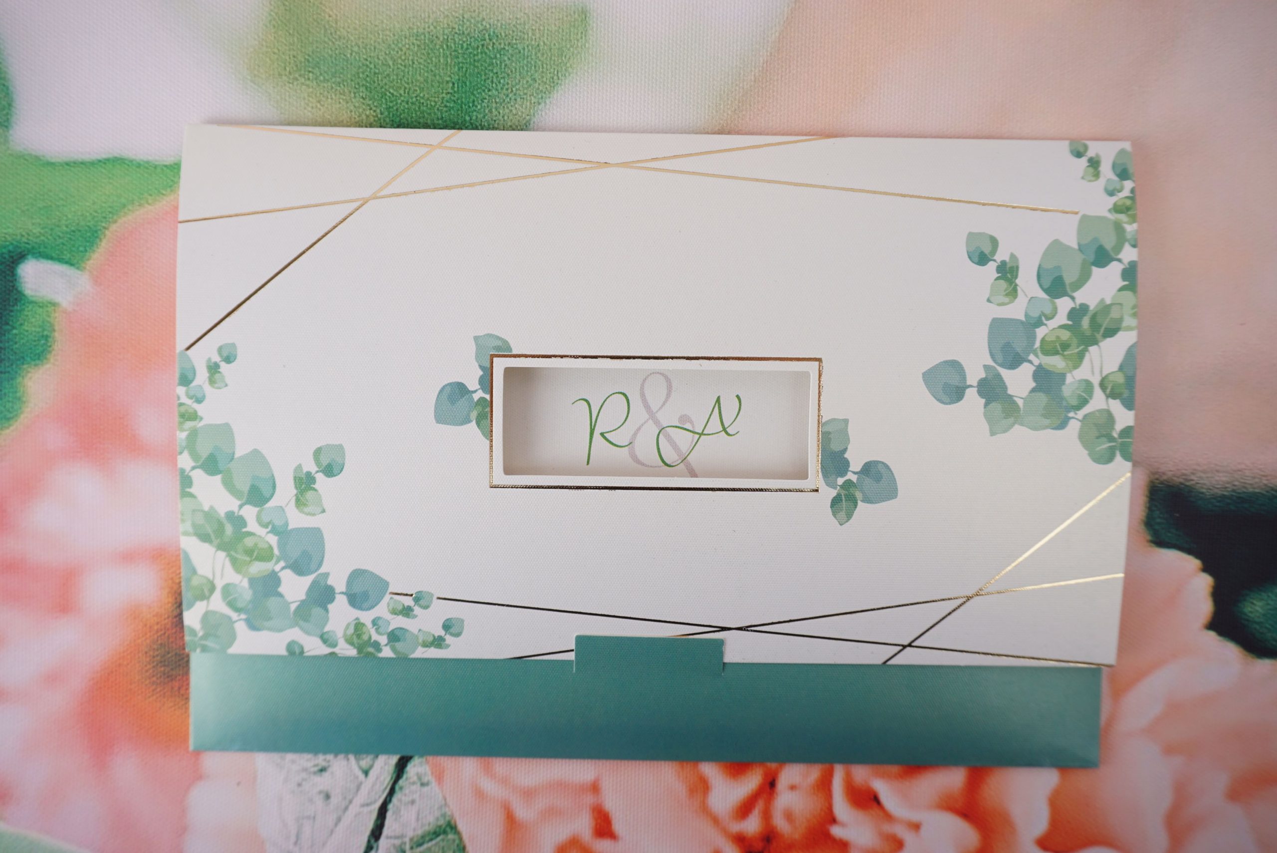 Invitatii de nunta confectionate dintr-un carton lucios cu model in partea de sus destinat textului. Acesta se introduce intr-un plic, cu model si decupaj prin care se vede numele mirilor sau initialele lor. Invitatia se personalizeaza cu textul pe care il doriti, corespunzator evenimentului dvs.