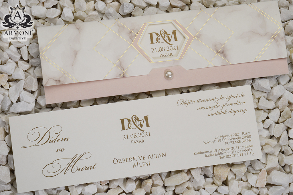 Invitatii de nunta confectionate dintr-un carton mat destinat textului. Acesta se introduce intr-un plic, cu model si decupaj prin care se vede numele mirilor sau initialele lor si are la inchidere o perluta. Invitatia se personalizeaza cu textul pe care il doriti, corespunzator evenimentului dvs.