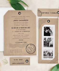 Invitatie de nunta vintage, ce reprezinta cateva elemente asociate cu tema calatoriei. Formata dintr-un carton pe care se scrie textul, 2 biletele scrise cu numele mirilor si data evenimentului sau orice alt mesaj scurt si un carton ce prezinta 2 mici taieturi pentru prinderea pozelor. Plicul este inclus in pret.