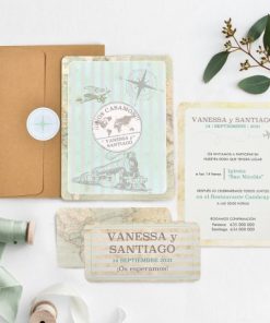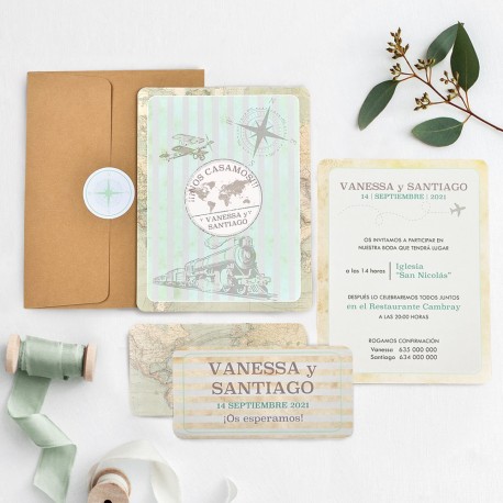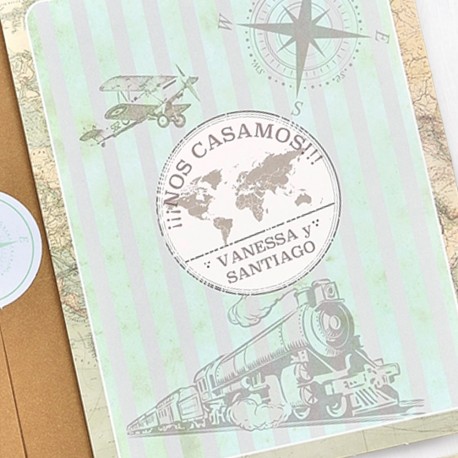 Invitatie de Nunta cu design travel. Invitatia nu se pliaza, pe fata are modelul vintage cu mijloace de transport (tren, avion), iar pe verso va fi printat textul dumneavoastra.