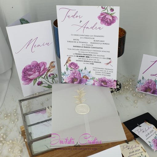 Daca aveti un eveniment tematic si doriti toate produsele asortate, putem realiza set format din invitatie, plic de bani, meniu, numar de masa si marturie cu acelasi design.