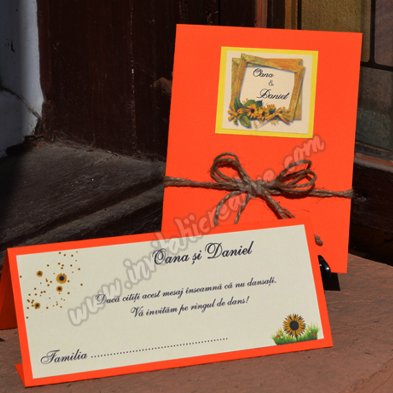 Invitatiile handmade Rustica cu Iuta si Floarea Soarelui sunt create dintr-un carton special orange, iar in interior avem un carton galben (de scris) cu imprimeu Floarea Soarelui.