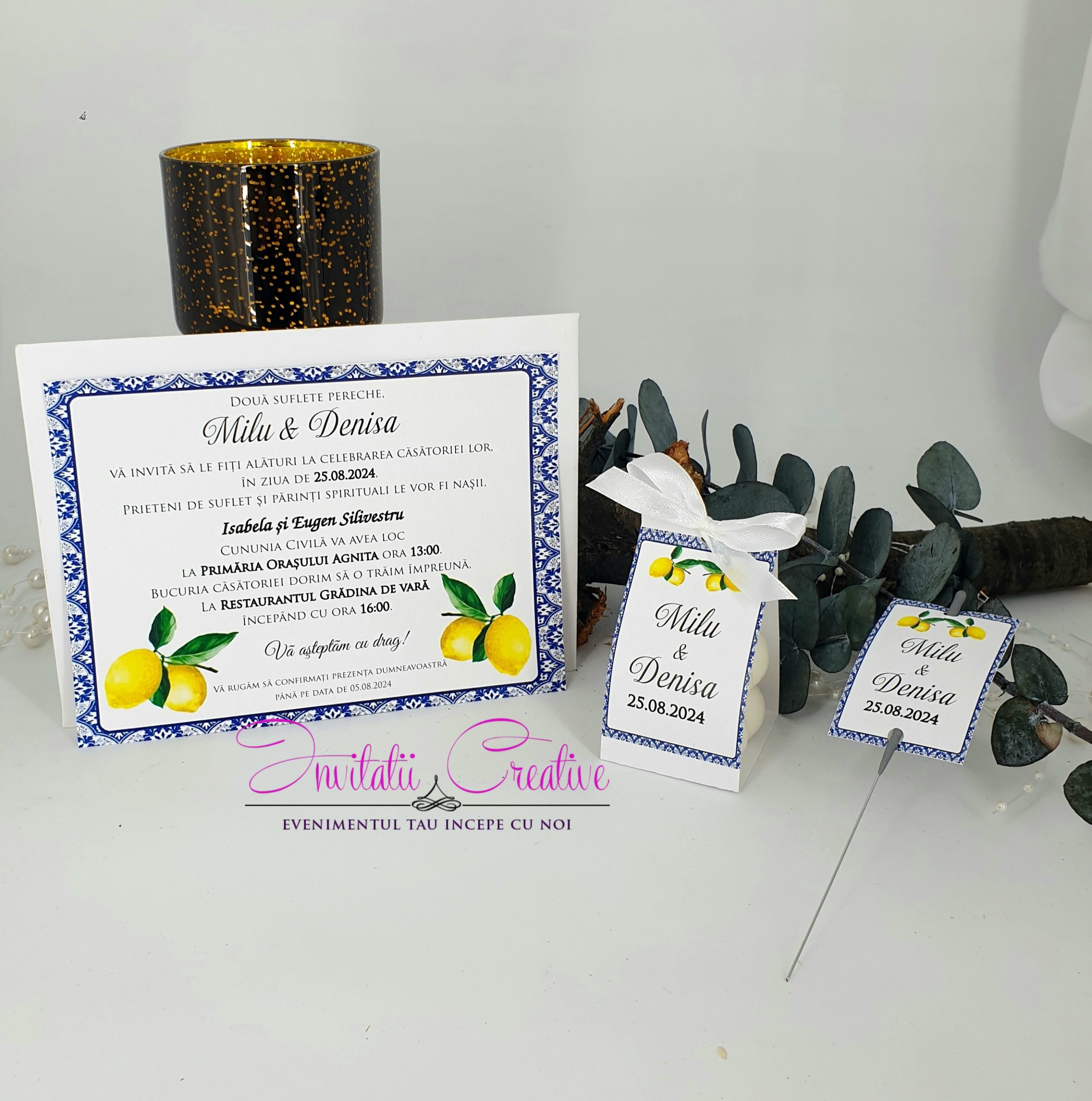 Daca aveti un eveniment tematic si doriti toate produsele asortate, putem realiza set format din invitatie, plic de bani, meniu, numar de masa si marturie cu acelasi design.