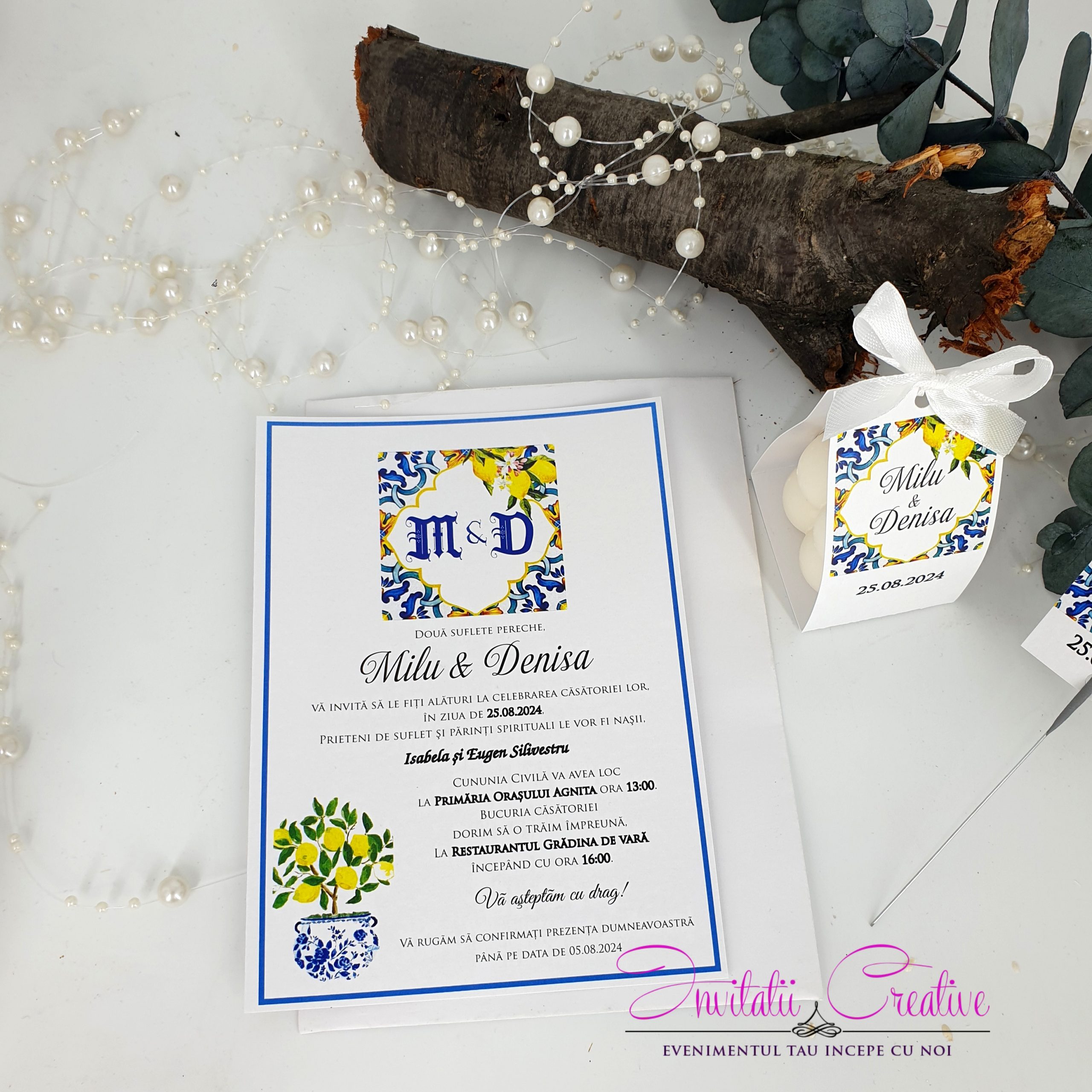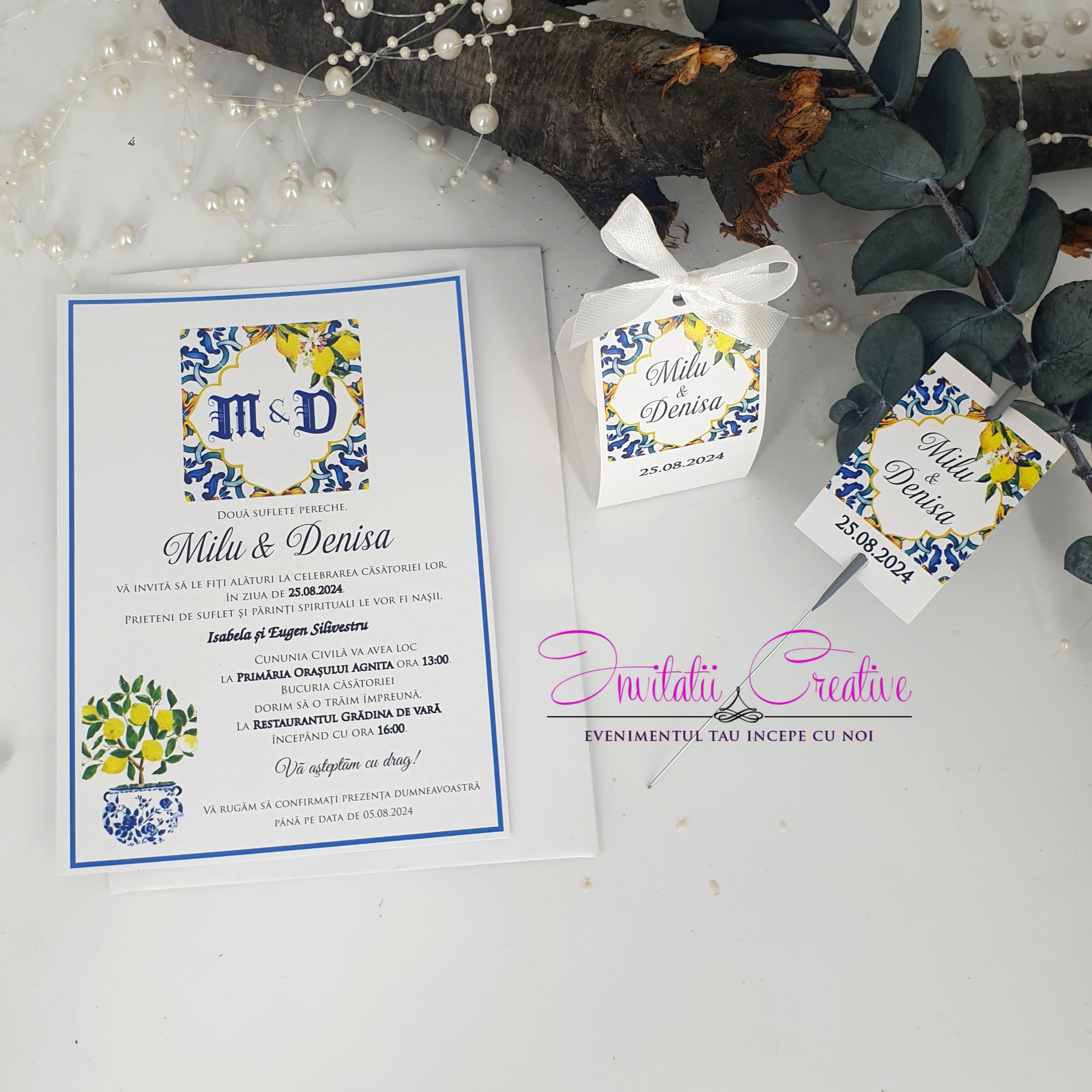Daca aveti un eveniment tematic si doriti toate produsele asortate, putem realiza set format din invitatie, plic de bani, meniu, numar de masa si marturie cu acelasi design.
