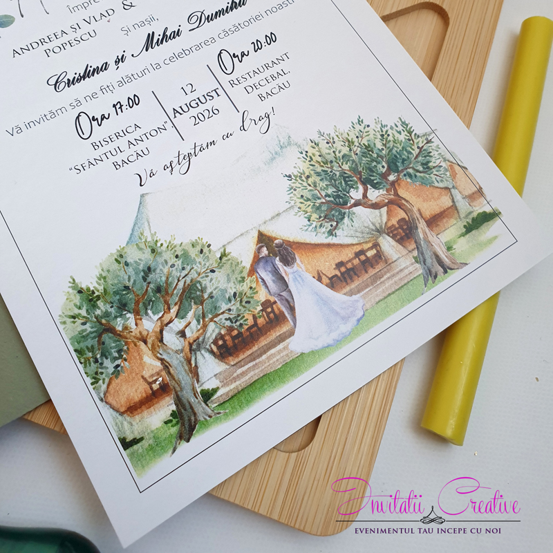 Invitatie de nunta olive cu miri in natura