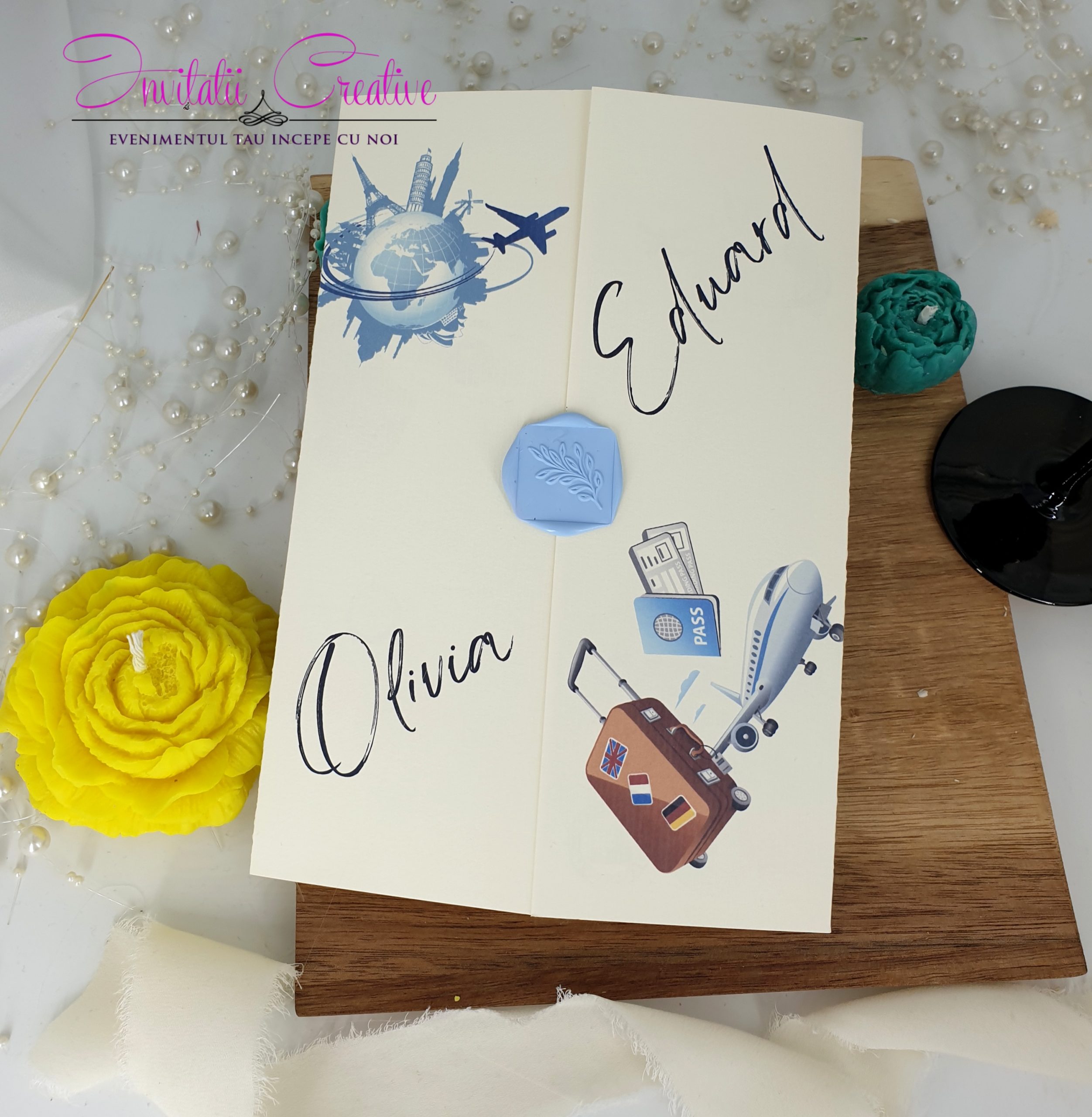 Daca aveti un eveniment tematic si doriti toate produsele asortate, putem realiza set format din invitatie, plic de bani, meniu, numar de masa si marturie cu acelasi design.