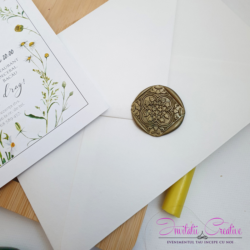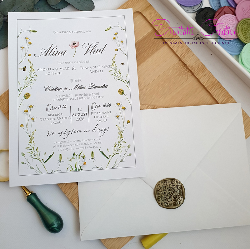 Invitatii de nunta cu floricele de camp si sigiliu patern