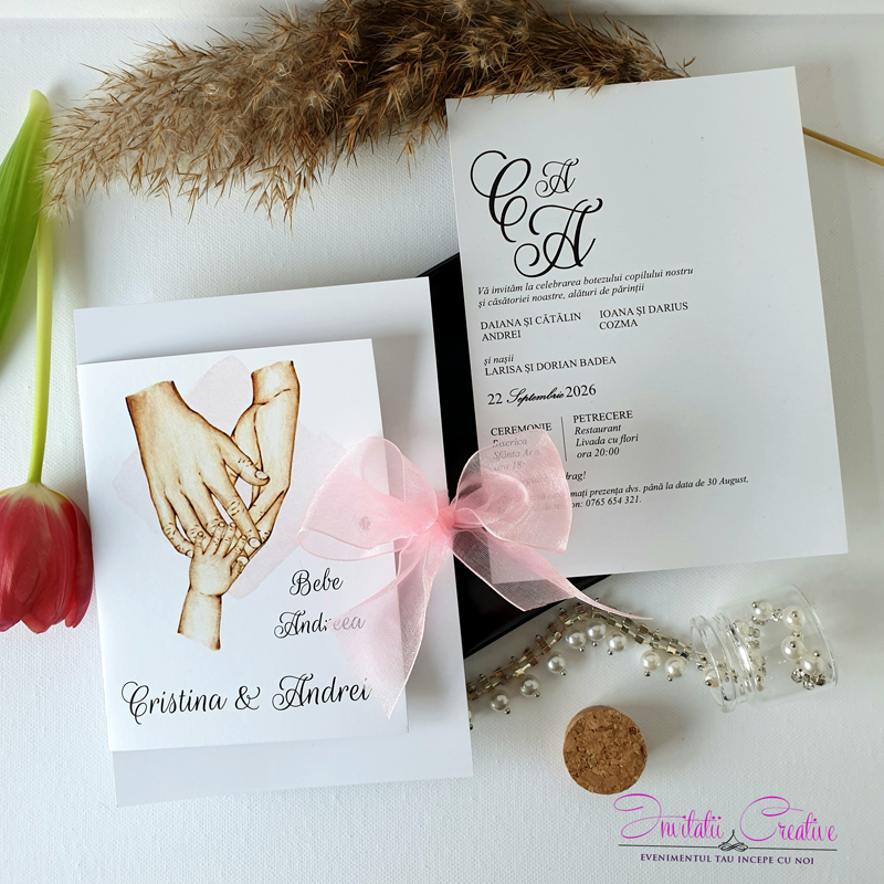 Tipărită pe carton premium de 300 g cu print digital laser, această invitație emană eleganță și căldură, exact așa cum își doresc părinții care își celebrează dragostea și noul membru al familiei.
