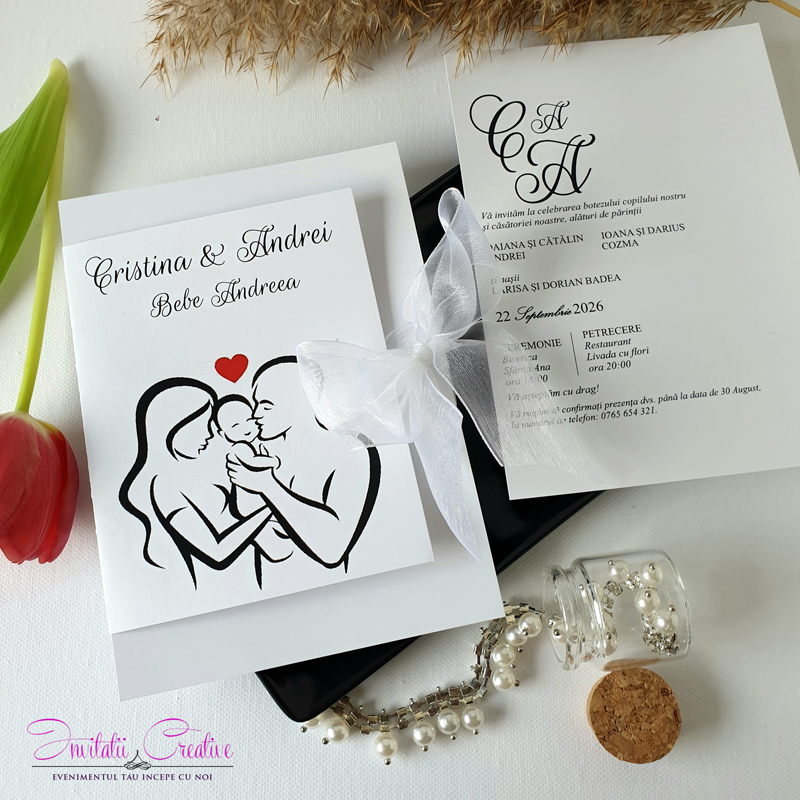Creată pe carton premium de 300 g, cu print digital laser pentru un aspect impecabil, această invitație este rafinată, dar și plină de emoție. Într-un format elegant, transmite un mesaj cald și personalizat către cei dragi.