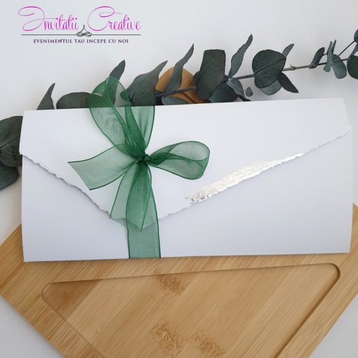 Invitatie de nunta cu frunze verde smarald si margini argintii
