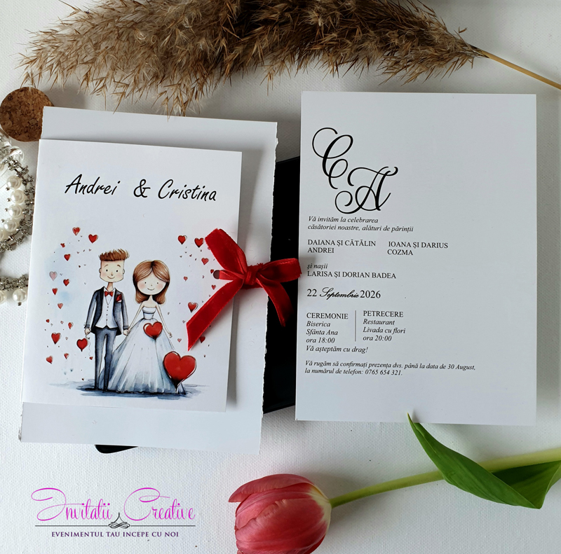 Invitatie de nunta cu miri haiosi si inimioare rosii
