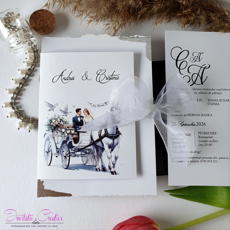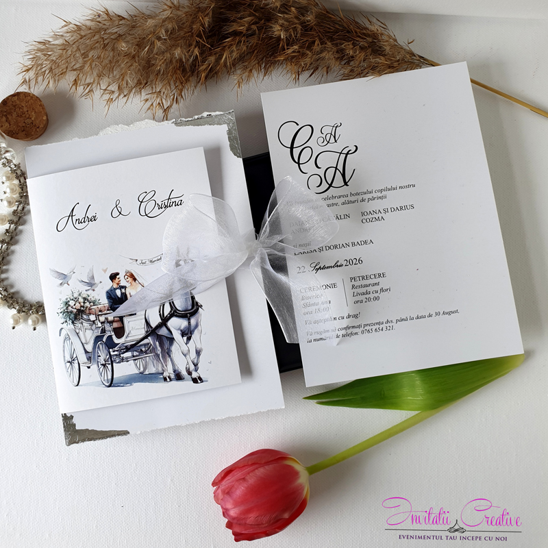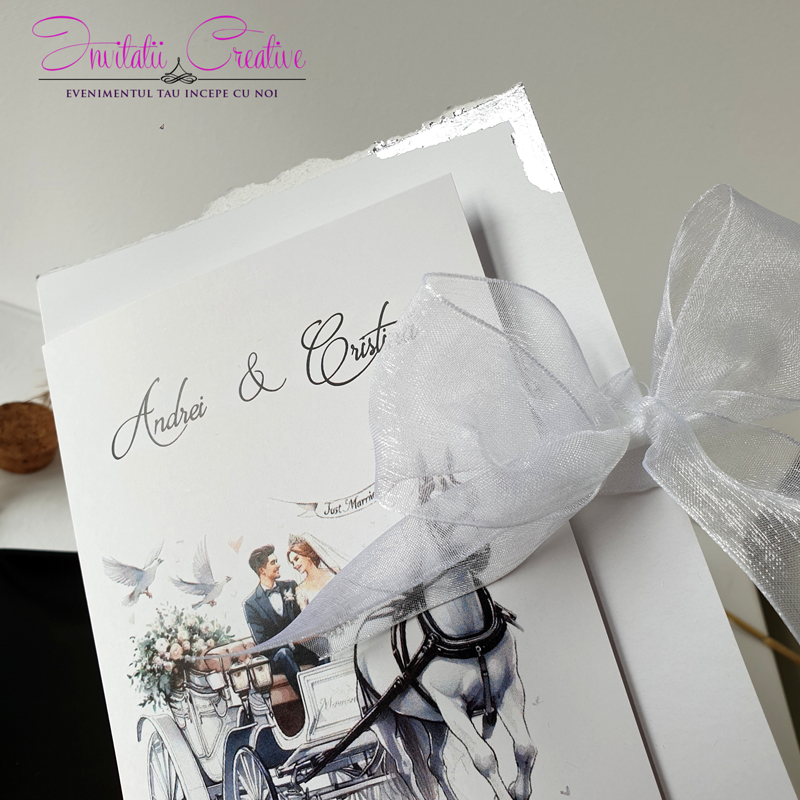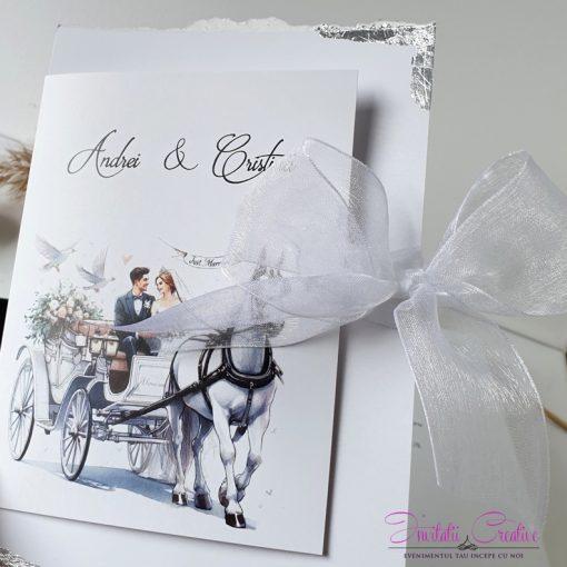 Invitatii de nunta cu caleasca si porumbei