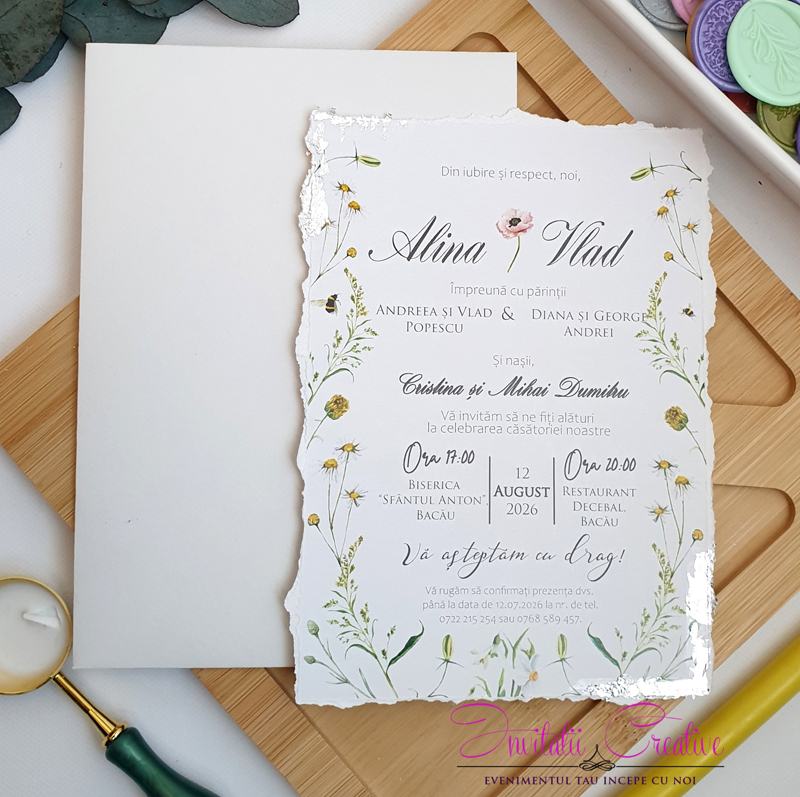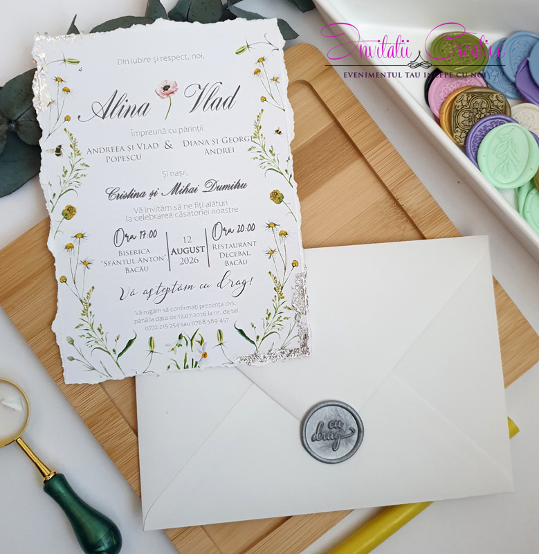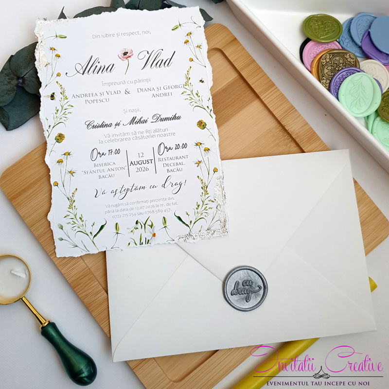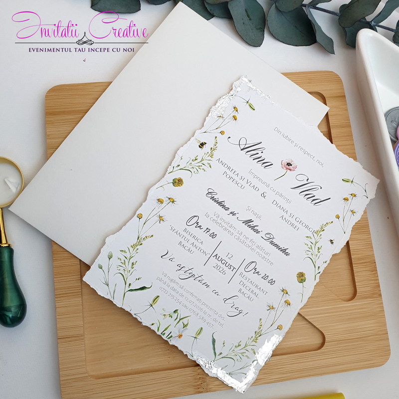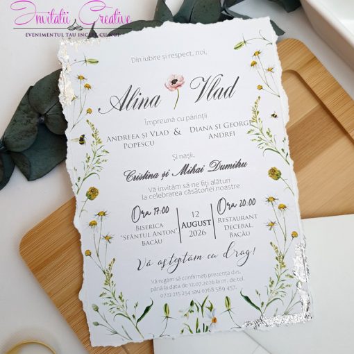 Invitatii de nunta cu floricele de camp si detalii argintii