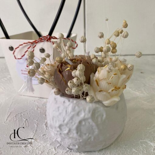 Cadou Special sub formă de Aranjament cu Lumanari din ceara naturala de soia, parfumata cu note delicate florale premium si flori uscate.