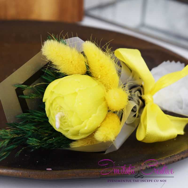 Marturie buchetel cu lumanare boboc bujor galben si pufi galbeni
