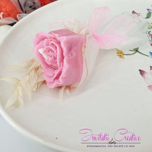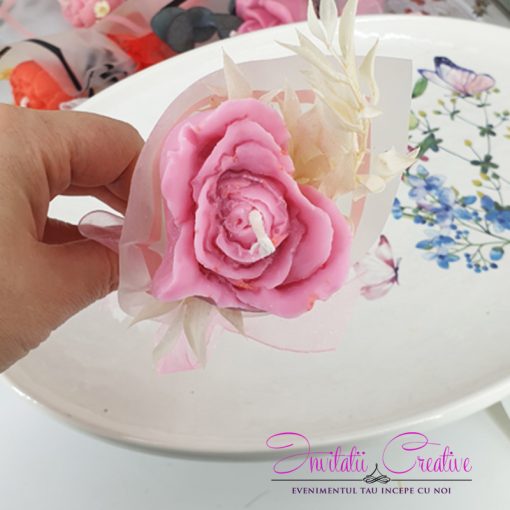 Marturie buchetel cu lumanare trandafir inima roz si frunzulite albe