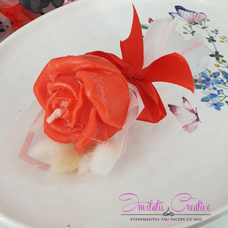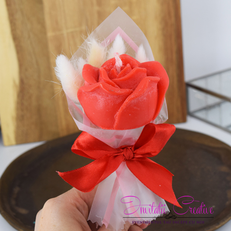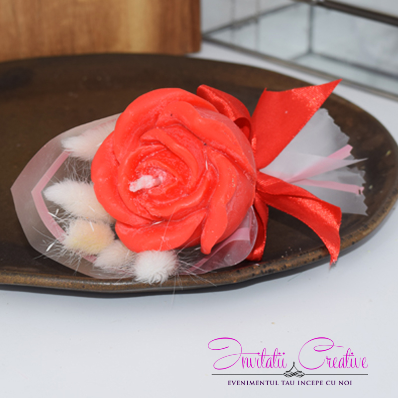Marturie buchetel cu lumanare trandafir rosu si pufi albi
