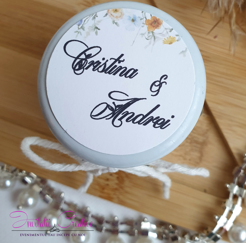 Eticheta cu motive florale delicate/Etichetele pot fi personalizate cu numele mirilor si data evenimentului sau numele bebelusului si data evenimentului/data nasterii, in functie de momentul celebrat.