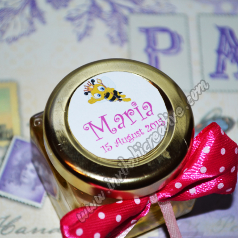 Etichetele pot fi personalizate cu numele mirilor si data evenimentului sau numele bebelusului si data evenimentului/data nasterii, in functie de momentul celebrat.