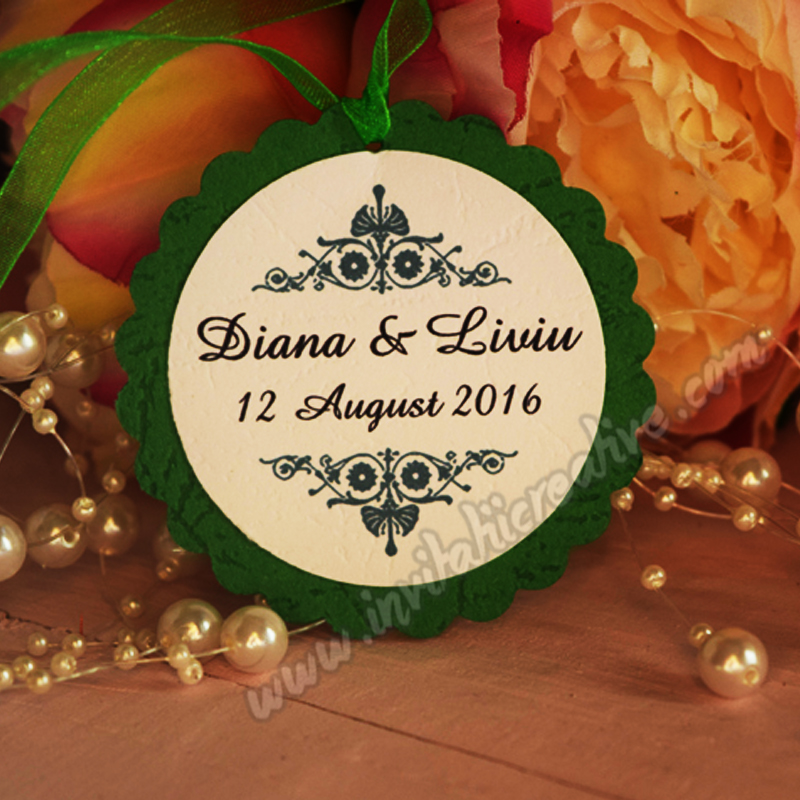 Etichetele sunt create din carton cu modele elegante, usor de asortat cu marturia, sticla de vin, cutiuta de prajituri sau chiar invitatia aleasa.