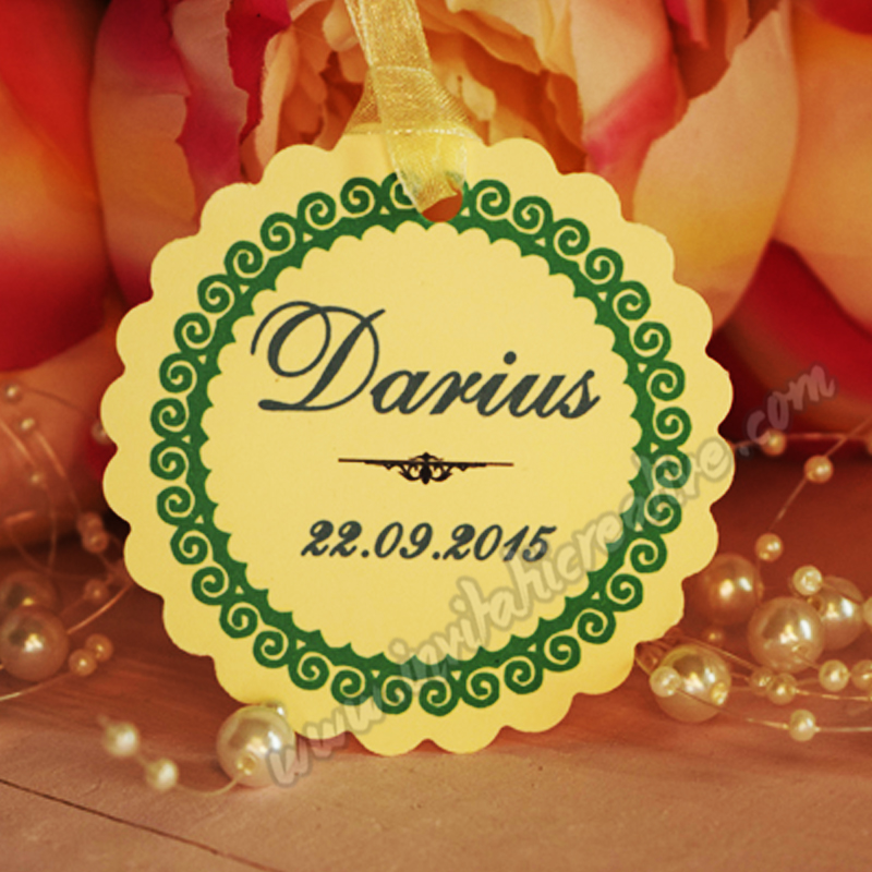 Etichetele sunt create din carton cu modele elegante, usor de asortat cu marturia, sticla de vin, cutiuta de prajituri sau chiar invitatia aleasa.
