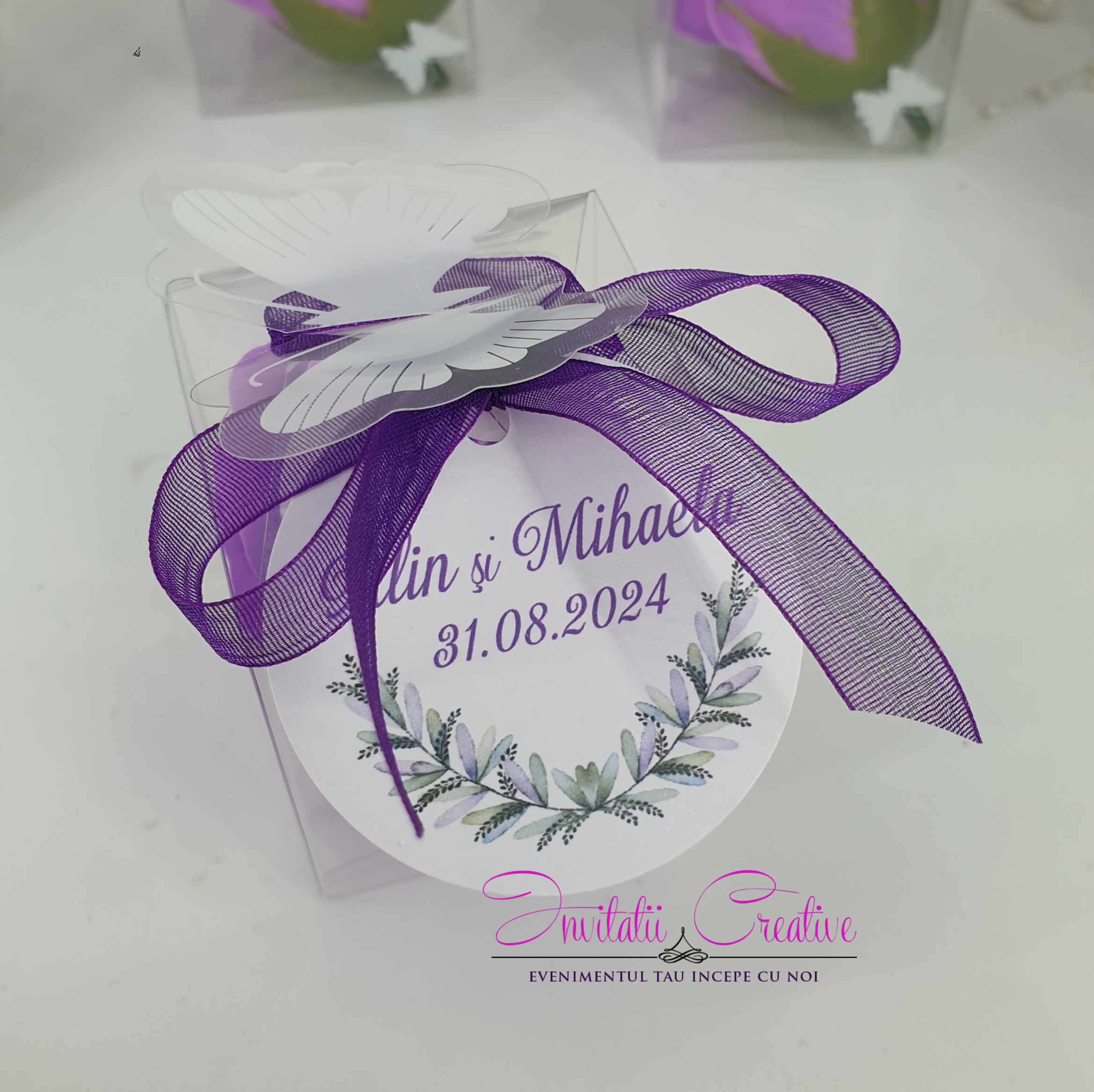 Etichetele pot fi personalizate cu numele mirilor si data evenimentului sau numele bebelusului si data evenimentului/data nasterii, in functie de momentul celebrat.