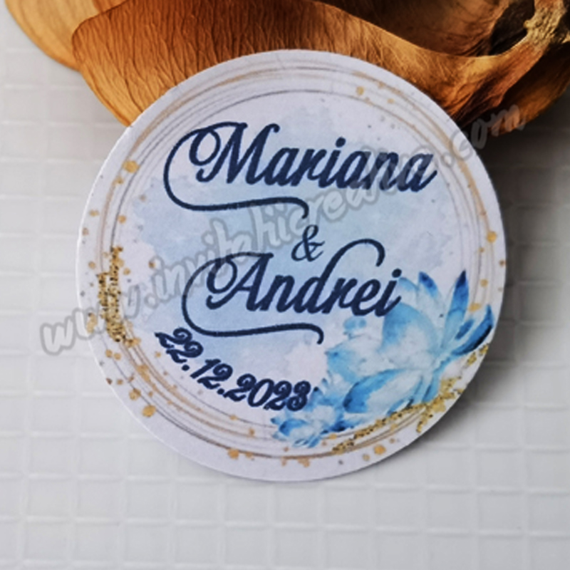 Etichetele pot fi personalizate cu numele mirilor si data evenimentului sau numele bebelusului si data evenimentului/data nasterii, in functie de momentul celebrat.